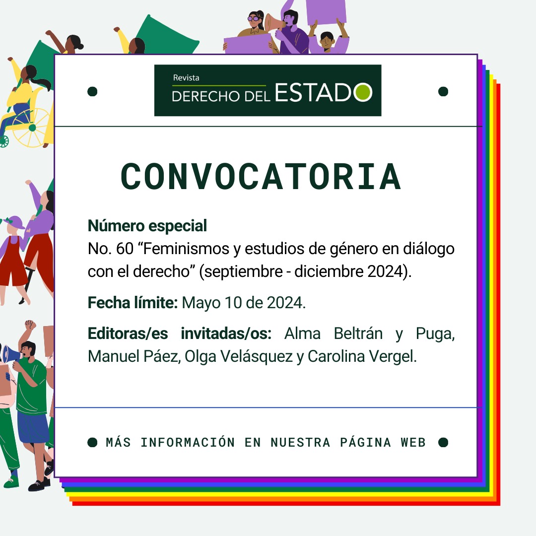 Considerando la injerencia en los debates jurídicos contemporáneos de estos campos de estudio, la Revista Derecho del Estado se complace en anunciar la apertura de la convocatoria para contribuciones destinadas a nuestro próximo número especial sobre «Feminismos y estudios de género en diálogo con el Derecho». Este número tiene como objetivo reunir investigaciones innovadoras y reflexiones creativas que muestren las posibilidades transformadoras que las perspectivas feministas, los estudios de género y la teoría queer han tenido y tienen aún en el ámbito jurídico. Particularmente, invitamos a toda la comunidad académica a enviar sus contribuciones sobre los siguientes temas: